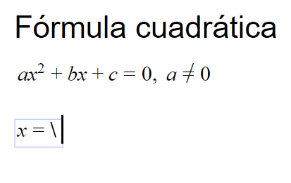Vamos a escribir la solución a la ecuación cuadrática usando solo el teclado, para ejemplificar. Entonces, comenzamos escribiendo la ecuación como ya aprendimos, y al llegar a la fracción, vamos a escribir \frac